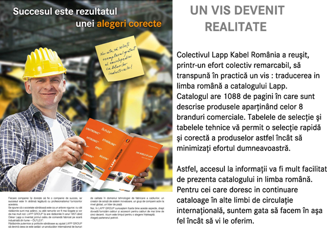 Colectivul Lapp Kabel România a reuşit, printr-un efort colectiv remarcabil, să transpună în practică un vis : traducerea in limba română a catalogului Lapp.Catalogul are 1088 de pagini în care sunt descrise produsele aparţinând celor 8 branduri comerciale.